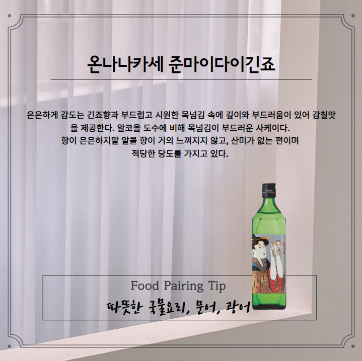 ✔️ 오무라야 주조장의 최고급주로, 아련히 느껴지는 단맛과 은은한 향, 부드러운 목넘김이 특징이에요 -