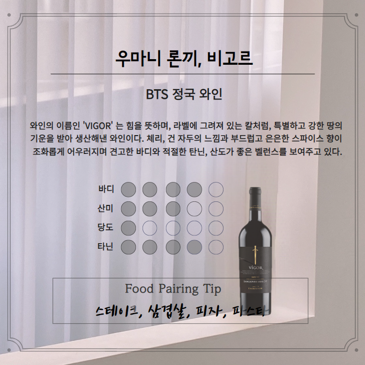 ✔️ 견고한 바디와 적절한 탄닌, 산도가 좋은 밸런스를 보여주며 스파이스향이 느껴지는 와인 이에요 -